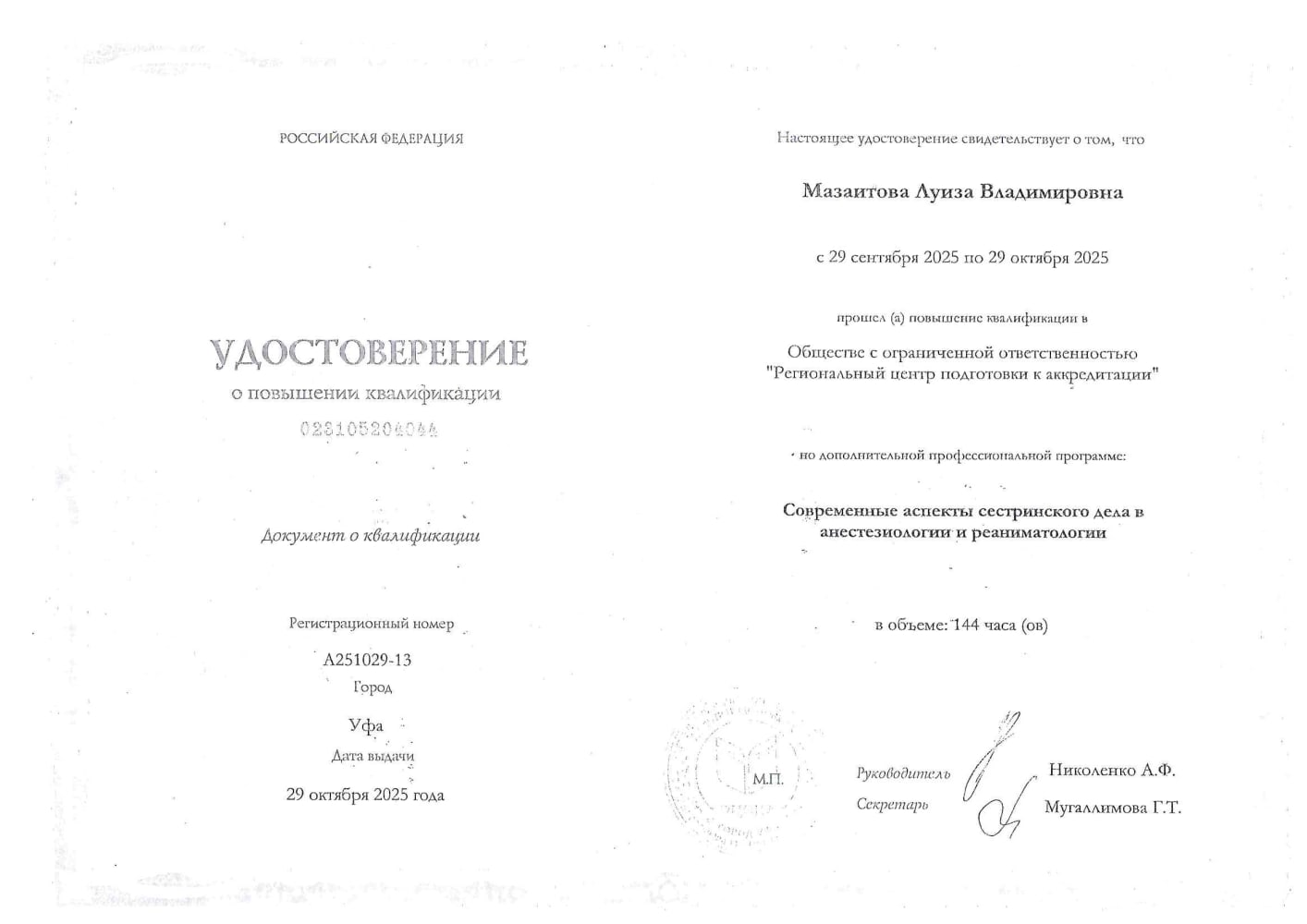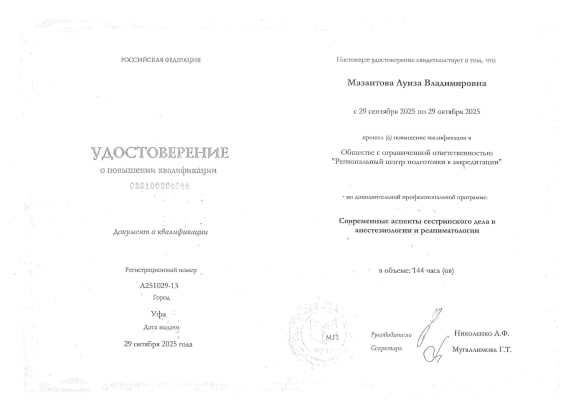 - Удостоверение о ПК 023105204044, рег. № А251029-13 от 29.10.2025 года «современные аспекты сестринского дела в анестезиологии и реаниматологии»