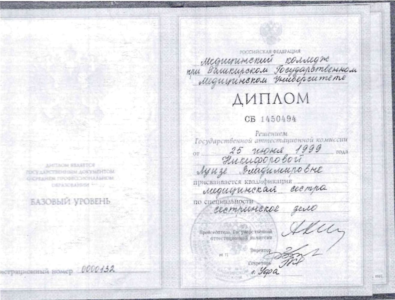 - Медицинский колледж при Башкирском государственном медицинском университете, Уфа. Диплом №СБ1450494 рег. № 0000132 от 25.06.1999 года «сестринское дело»