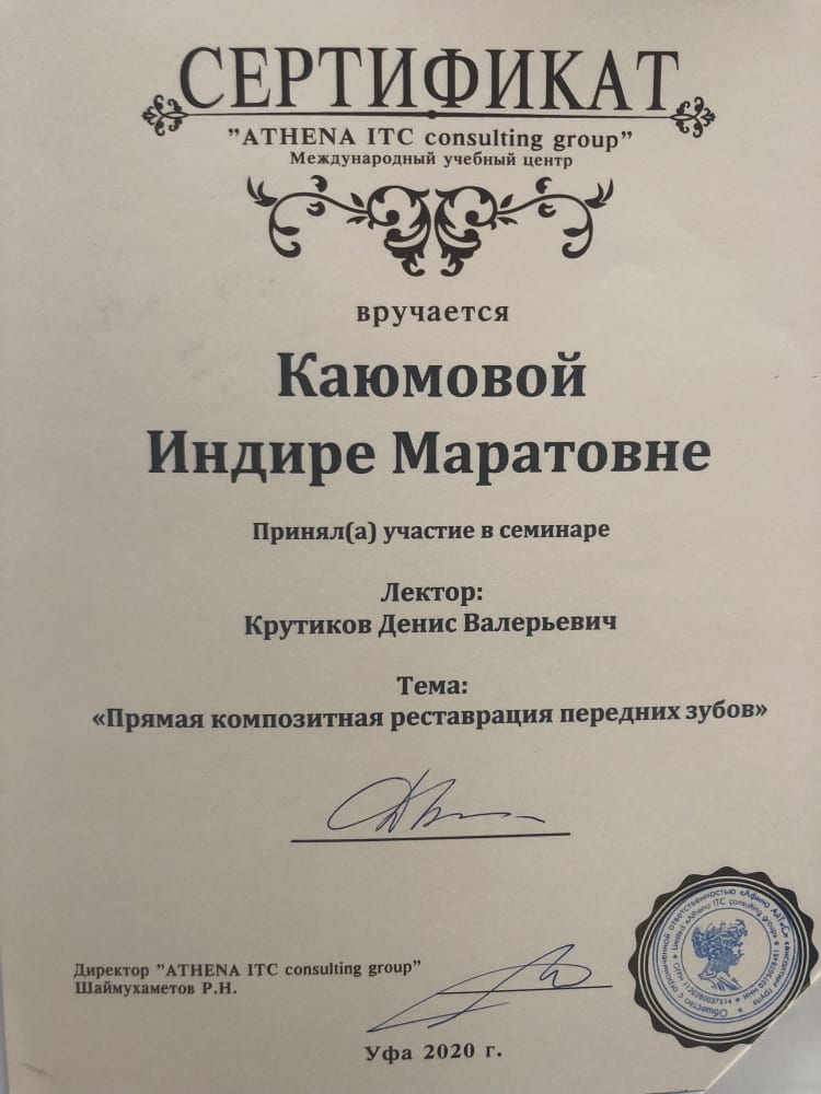 - Международный учебный центр «Athena ITS consulting Group» Прямая композитная реставрация передних зубов», лектор Крутиков Денис Валерьевич. Уфа, 2020 год