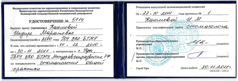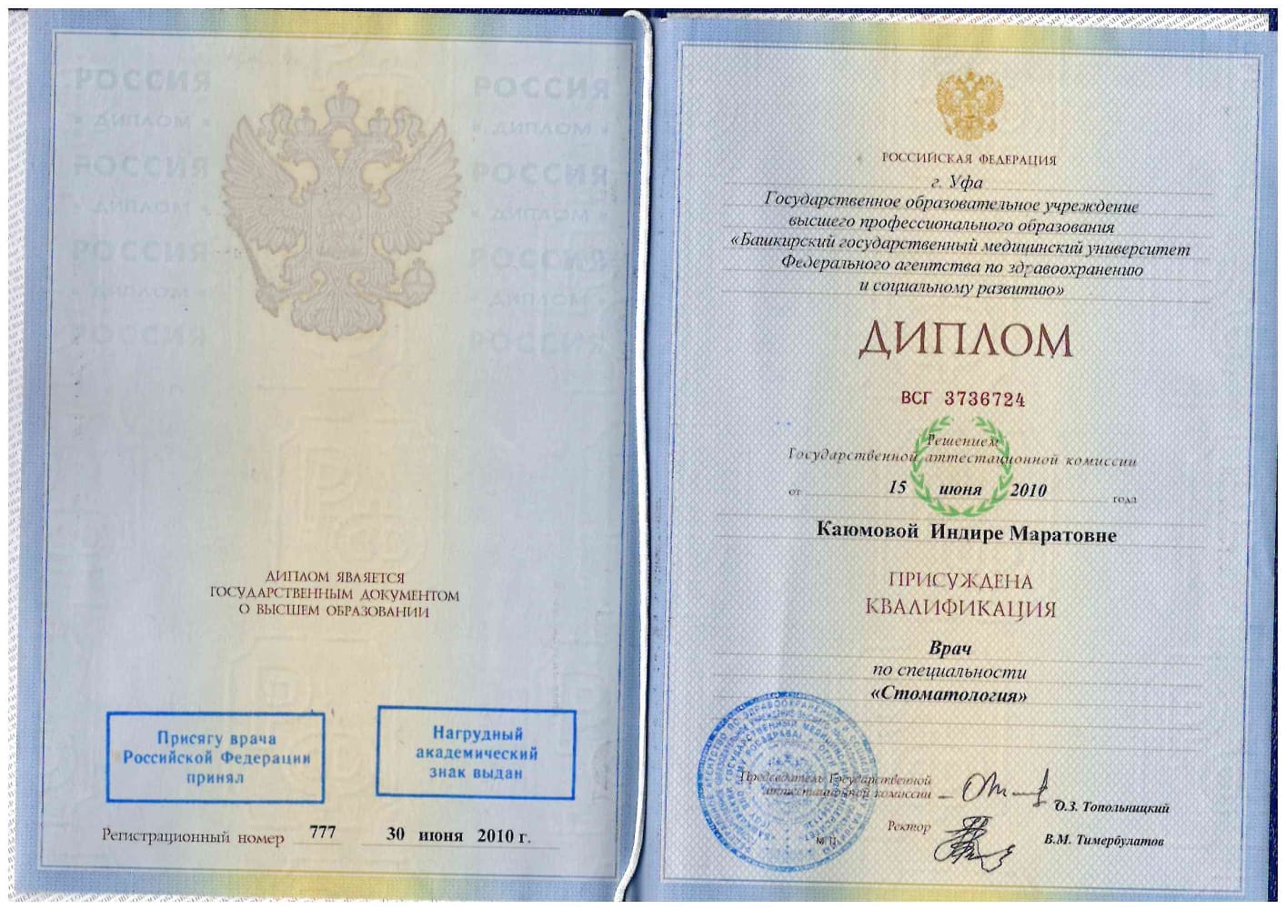 - Башкирский государственный медицинский университет, диплом ВСГ 3736724, рег. №777 от 30.06.2010 года, «стоматология»