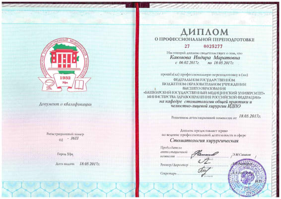 - Диплом о ПП 27 0025277, рег. №02-3633 от 18.05.2017 года, «стоматология хирургическая»