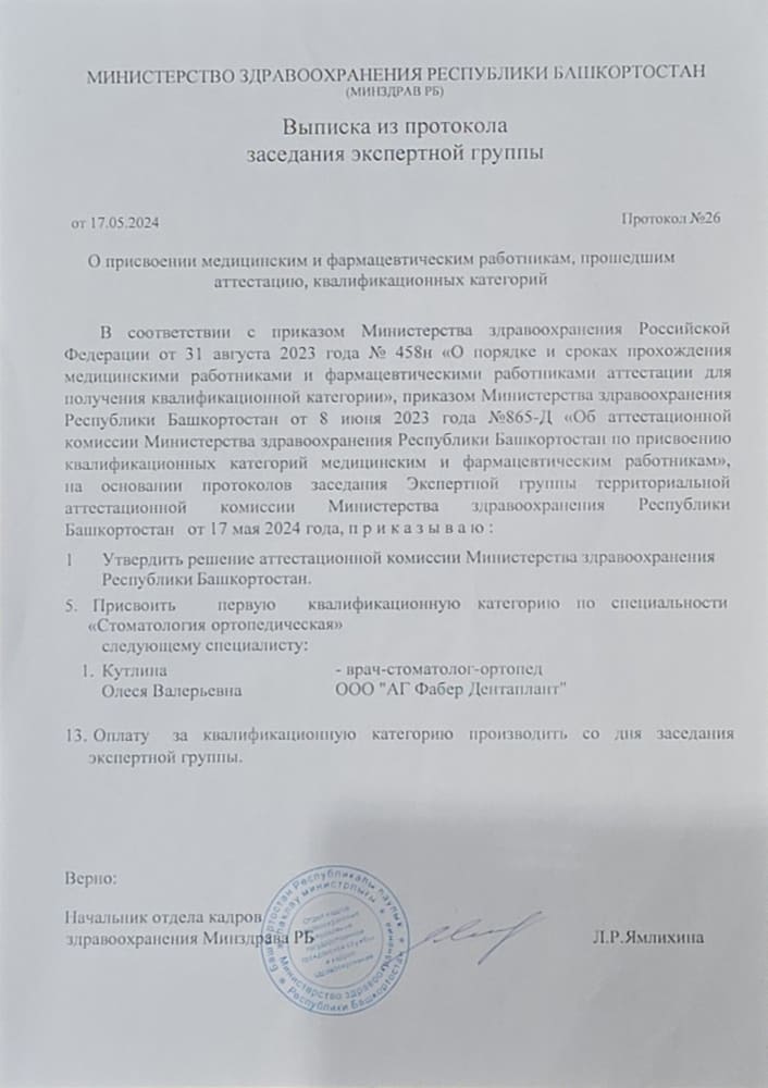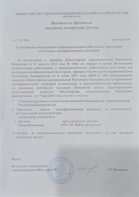 - Удостоверение о ПК 122405543257, рег. № 0224 от 16.04.2022 г. «стоматология ортопедическая»