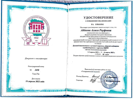 - Удостоверение о ПК 04 096096, рег. № 02-2458 от 16.04.2022 года «лучевая диагностика инсультов»