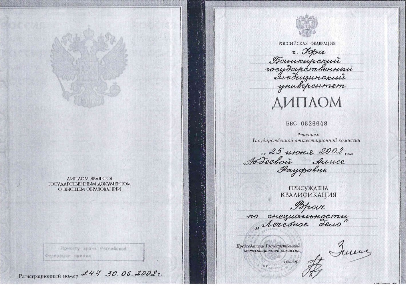 - Башкирский государственный медицинский университет, диплом БВС 0626648, рег. № 247 от 30.06.2002 года, «лечебное дело»