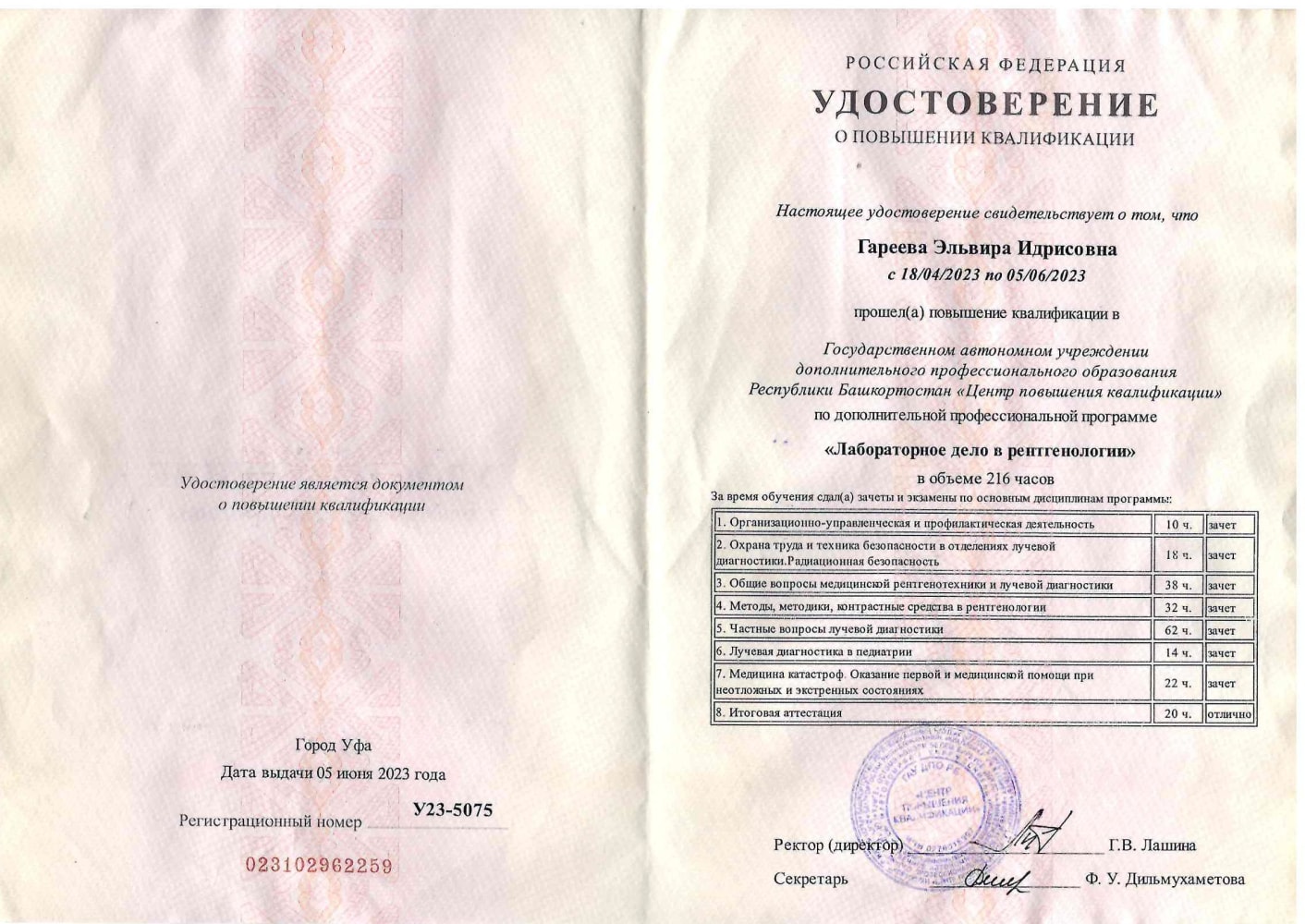 - Удостоверение о ПК 023102962259, рег. № У23-5075 от 05.06.2023 года «лабораторное дело в рентгенологии»