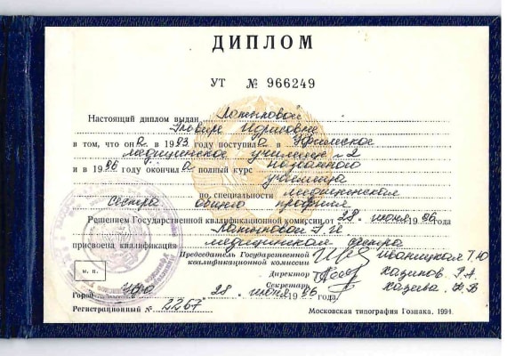 - Уфимское медицинское училище № 2, диплом УТ № 966249, рег. № 2267, от 28.06.1996 года, «медицинская сестра общего профиля»