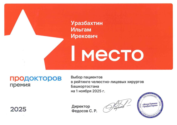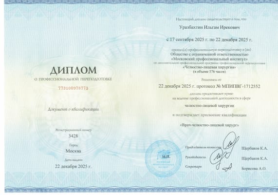 - Диплом о профессиональной переподготовке 7731 00978773 рег. номер 3428 от 22.12.2025 года по программе «челюстно-лицевая хирургия»