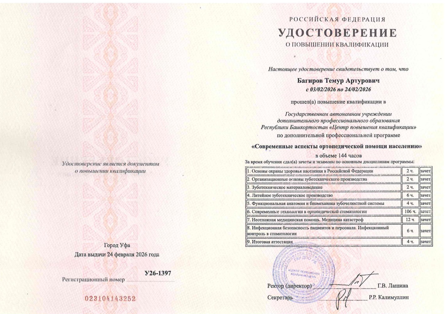 - Удостоверение о ПК 023104143252, рег. № У26-1397 от 24.02.2026 года «современные аспекты ортопедической помощи населению»