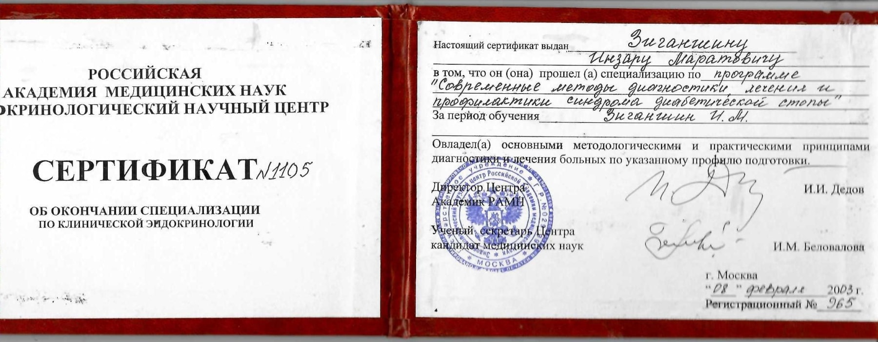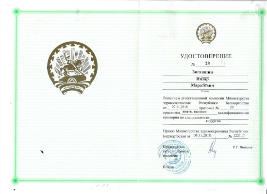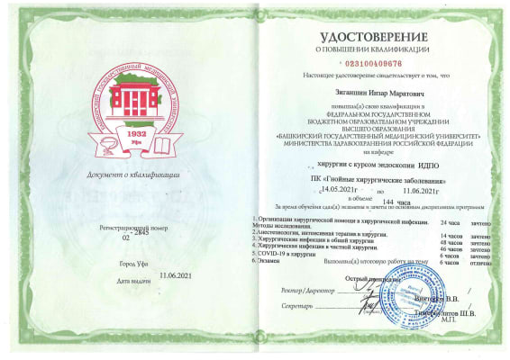 - Удостоверение о ПК 023100409676, рег. № 02-2845 от 11.06.2021 года «хирургия с курсом эндоскопии»