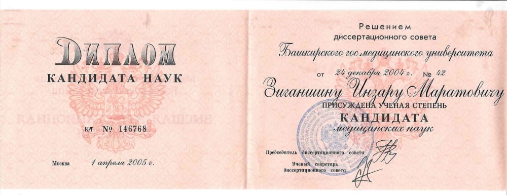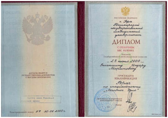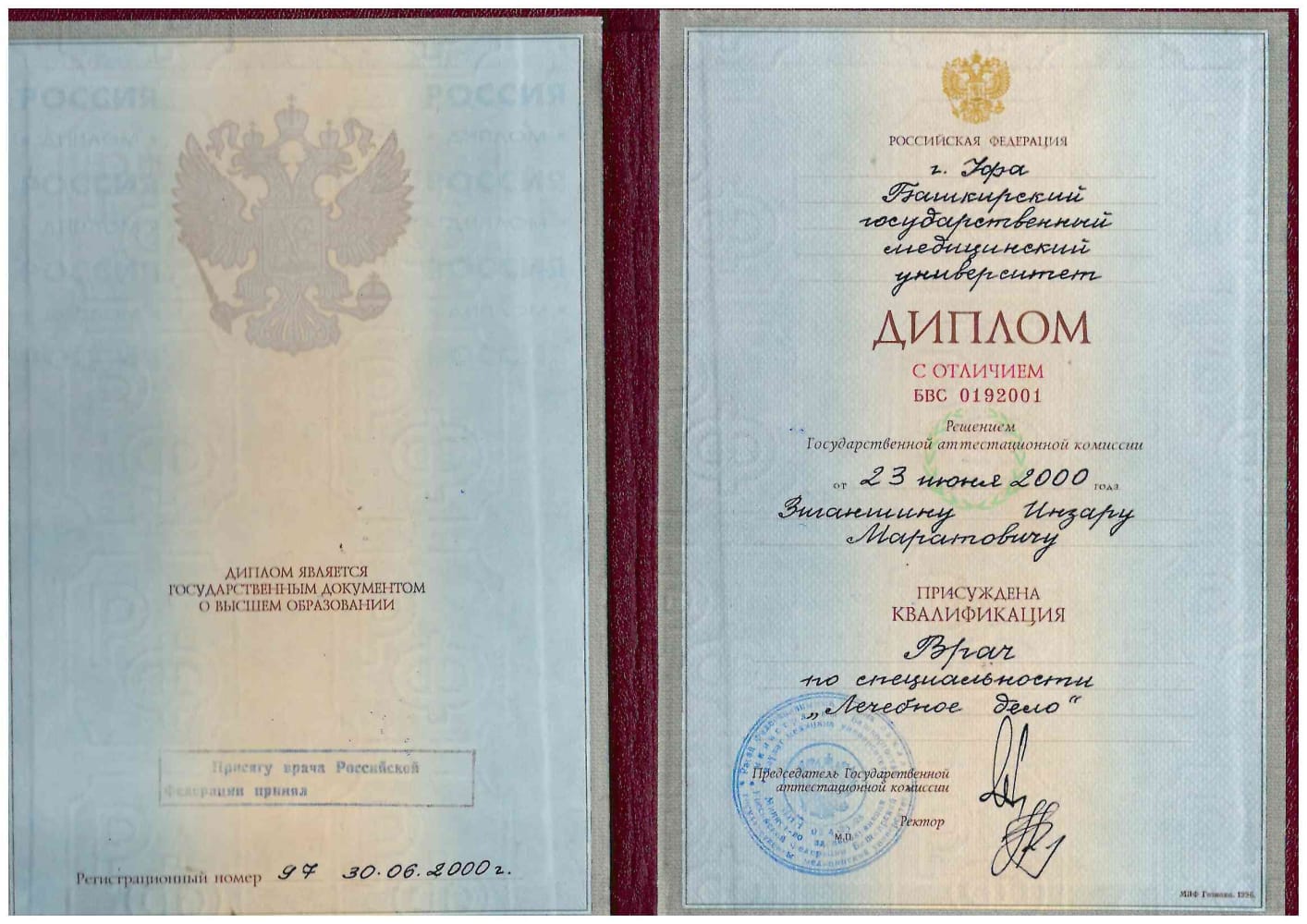 - Башкирский государственный медицинский университет, диплом БВС 0192001, от 30.06.2000 года, «лечебное дело»