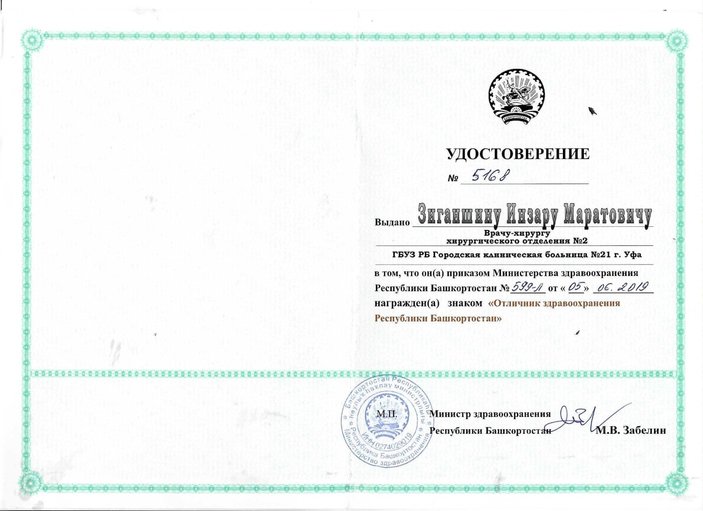 Отличник здравоохранения Республики Башкортостан (приказ Министерства здравоохранения Республики Башкортостан № 599-Л от 05.06.2019 года)
